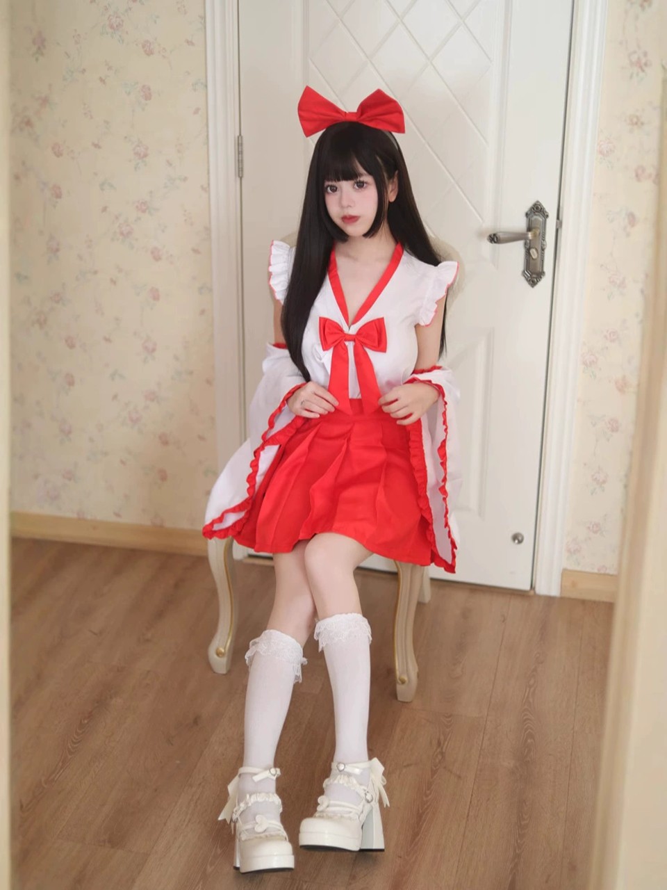 巫女風 メイド服 大きいサイズ コスプレ 仮装 コスチューム フリル リボン エプロン 制服 ウェイトレス 女の子 可愛い 萌え 正統衣装 原宿 お嬢様 文化祭 ハロウィン