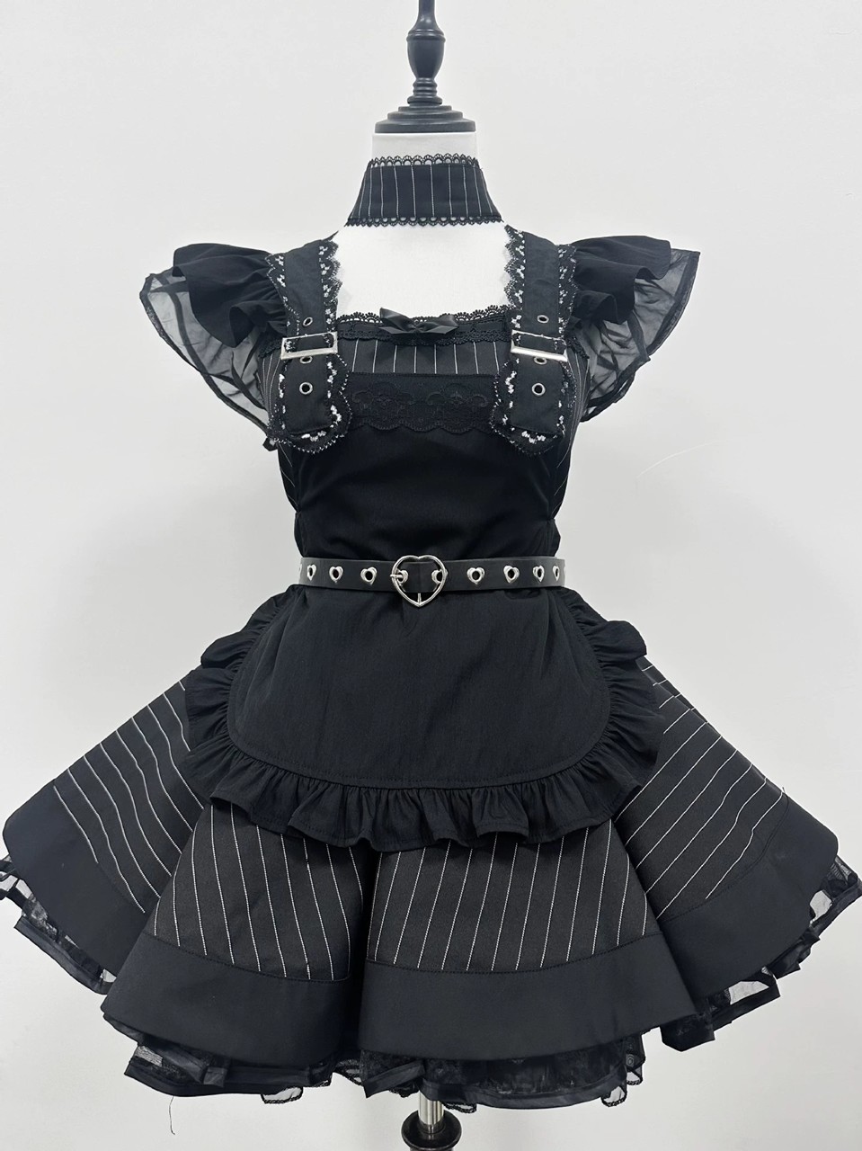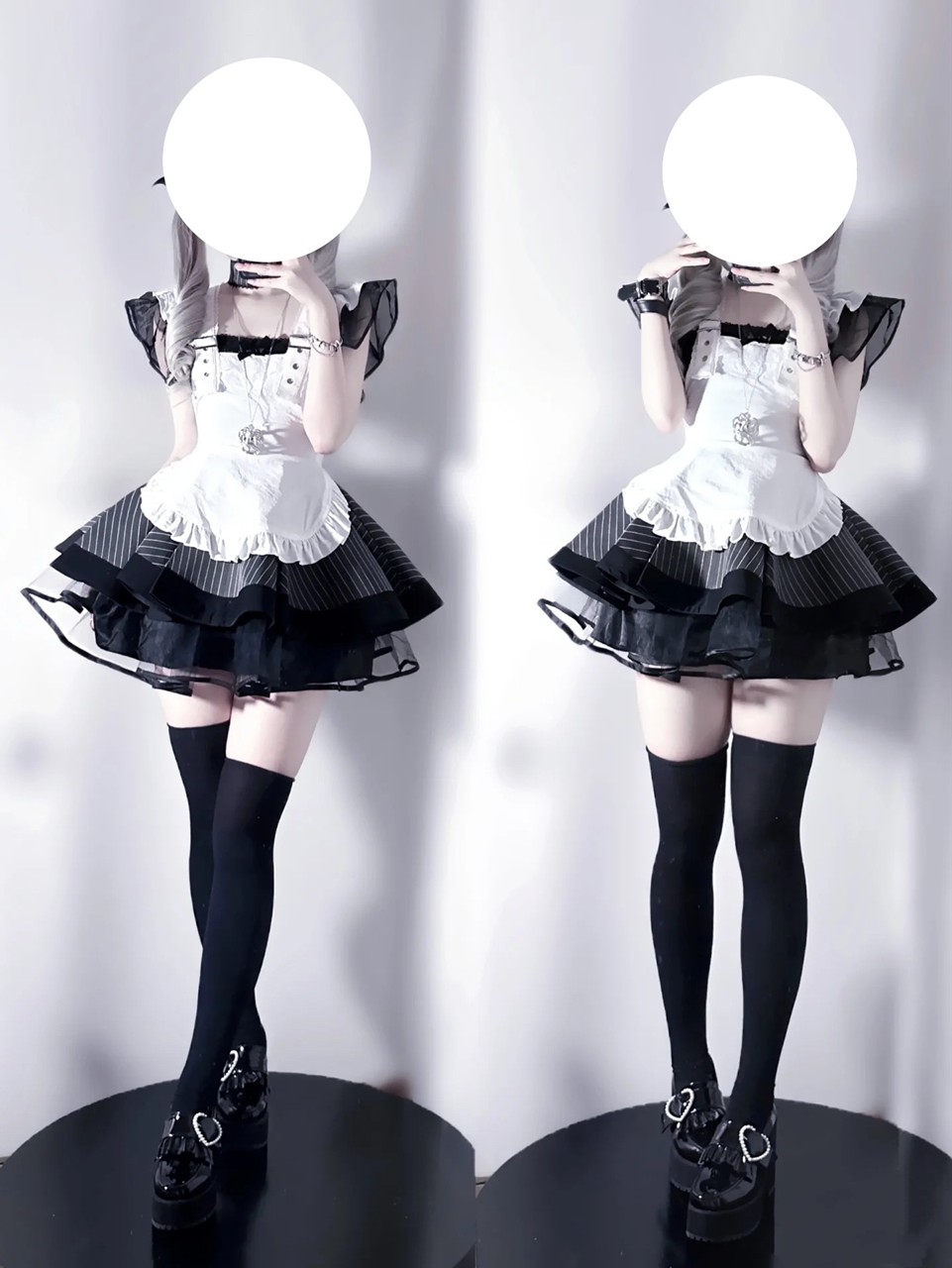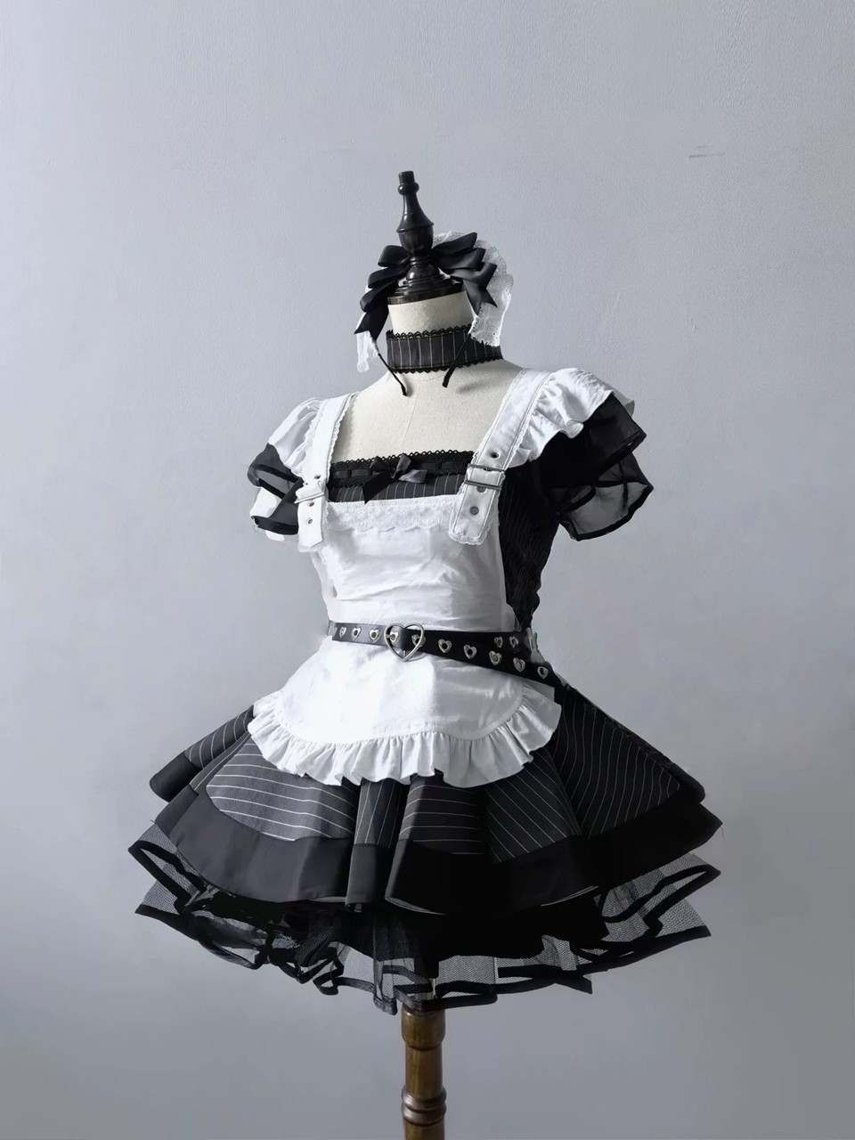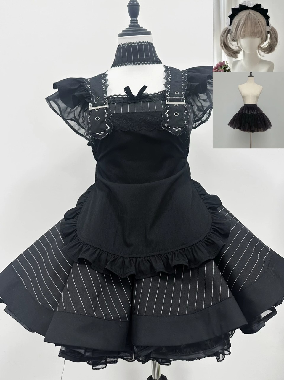 レトロな黒と白のストライプロリータメイド服 大きいサイズ コスプレ衣装 [g688]