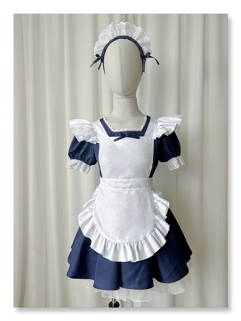 シンプルなエプロン付き可愛いメイド服 ミニ丈ワンピース コスチューム 半袖 フリル カチューシャ付き 蝶結び コスプレ衣装