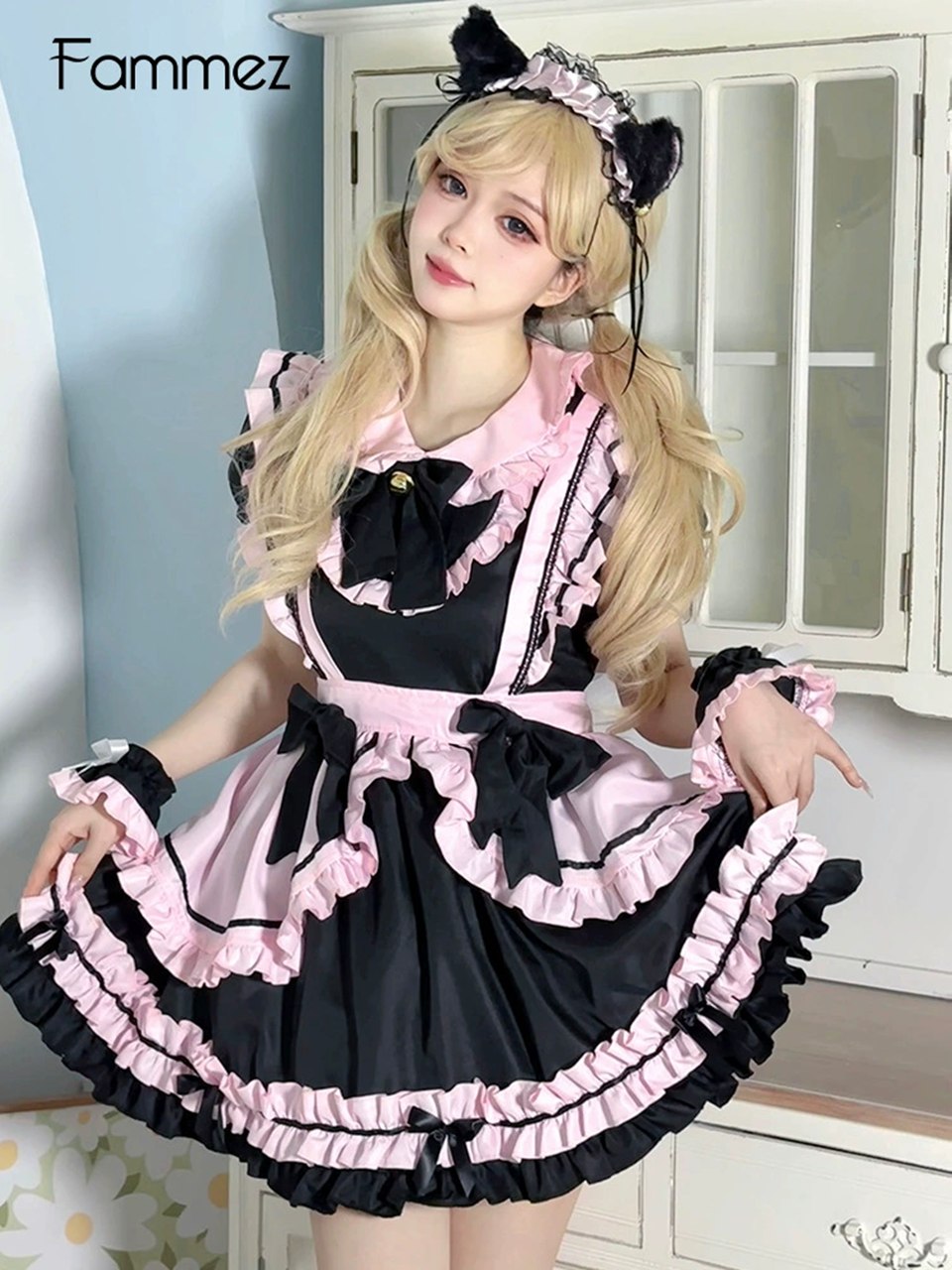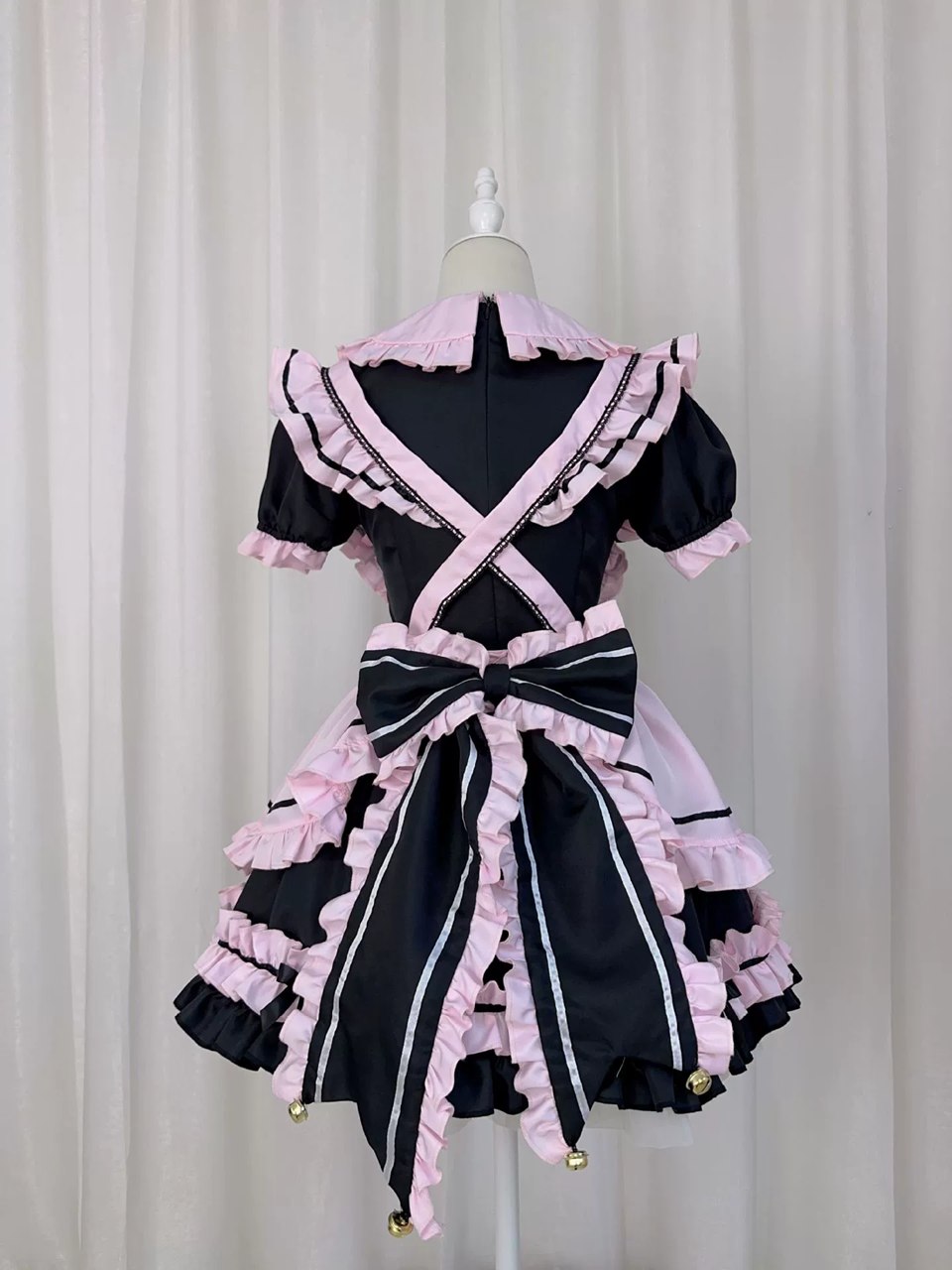 ピンクのふりふり可愛いメイド服 ミニ丈ワンピース コスチューム 半袖 フリル カチューシャ付き 蝶結び コスプレ衣装