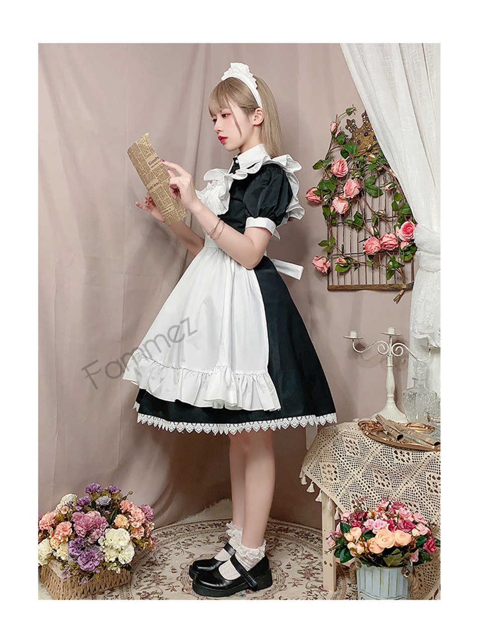 英国風 可愛いメイド服 ミニ丈ワンピース コスチューム 半袖 フリル カチューシャ付き 蝶結び コスプレ衣装 [g738]