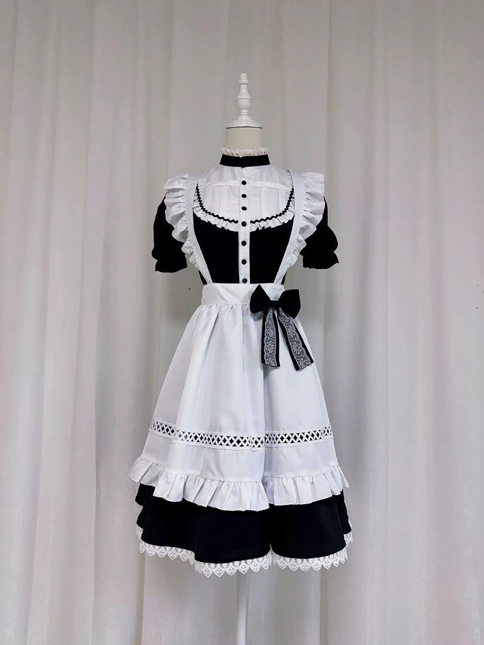 英国風 可愛いメイド服 ミニ丈ワンピース コスチューム 半袖 フリル カチューシャ付き 蝶結び コスプレ衣装 [g739]