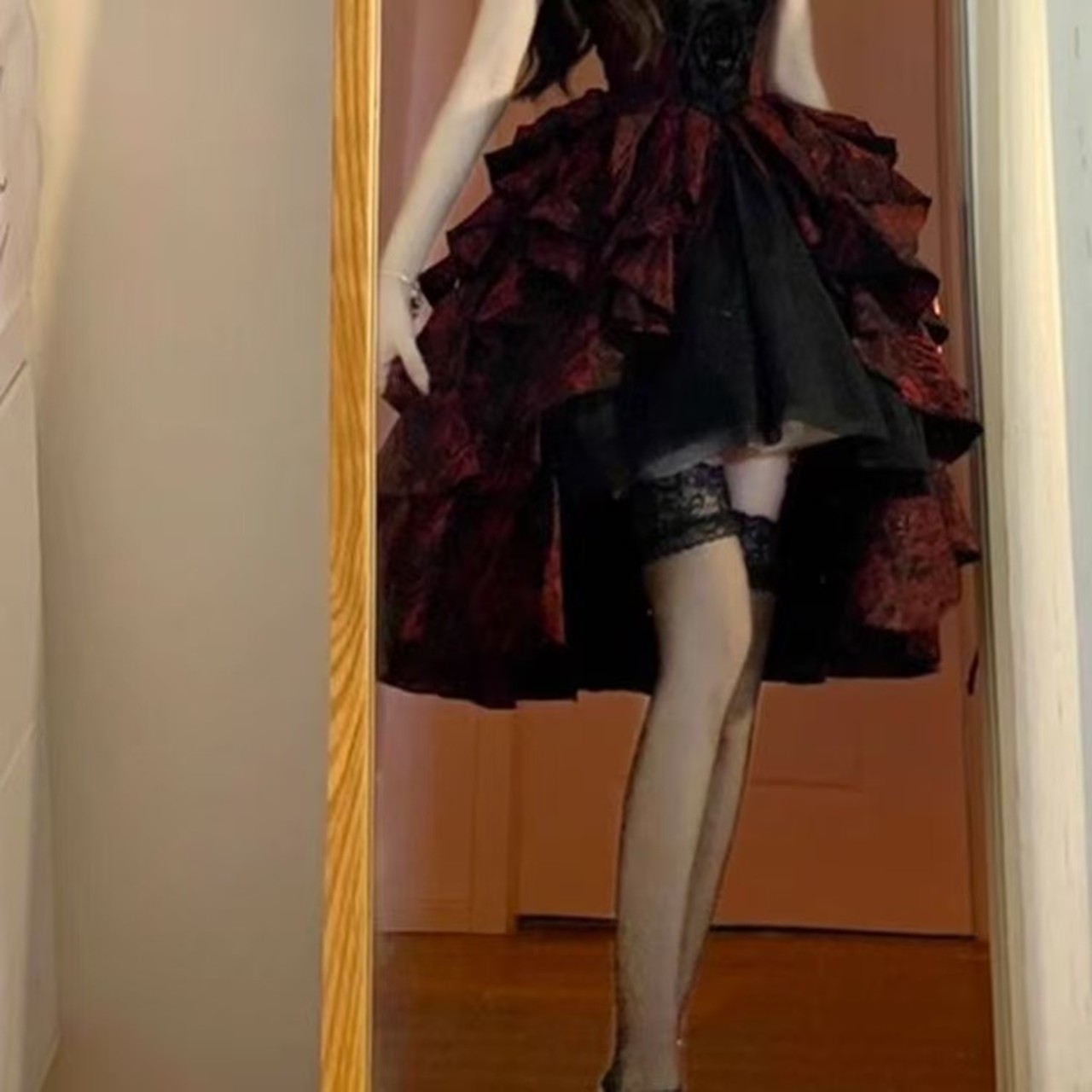 ワンピース レディース 黒魔女 ダークゴシック 宮廷風 ロリータ プリンセスドレス オフショルダー Vネック 半袖 フリル袖 リボン ボタン Aライン ミニ丈 ショート丈 ストリート系 異素材切り替え 黒 赤