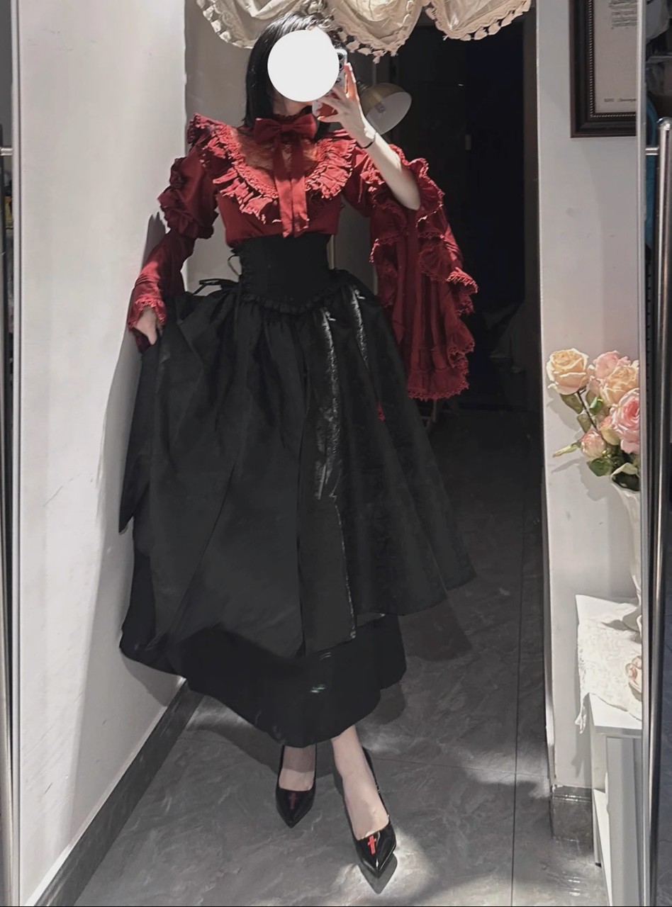 ロリータ コスチューム ハロウィン ブラウス スカート 上下セット レトロ風 リボン レディース ゴスロリ 暗黒風 長袖 フリル コスプレ 衣装 洋服 日常 仮装 パーティ イベント ステージ 文化祭 学園祭 春夏秋用 ブラック 黒 ホワイト 白 ワインレッド S M L XL
