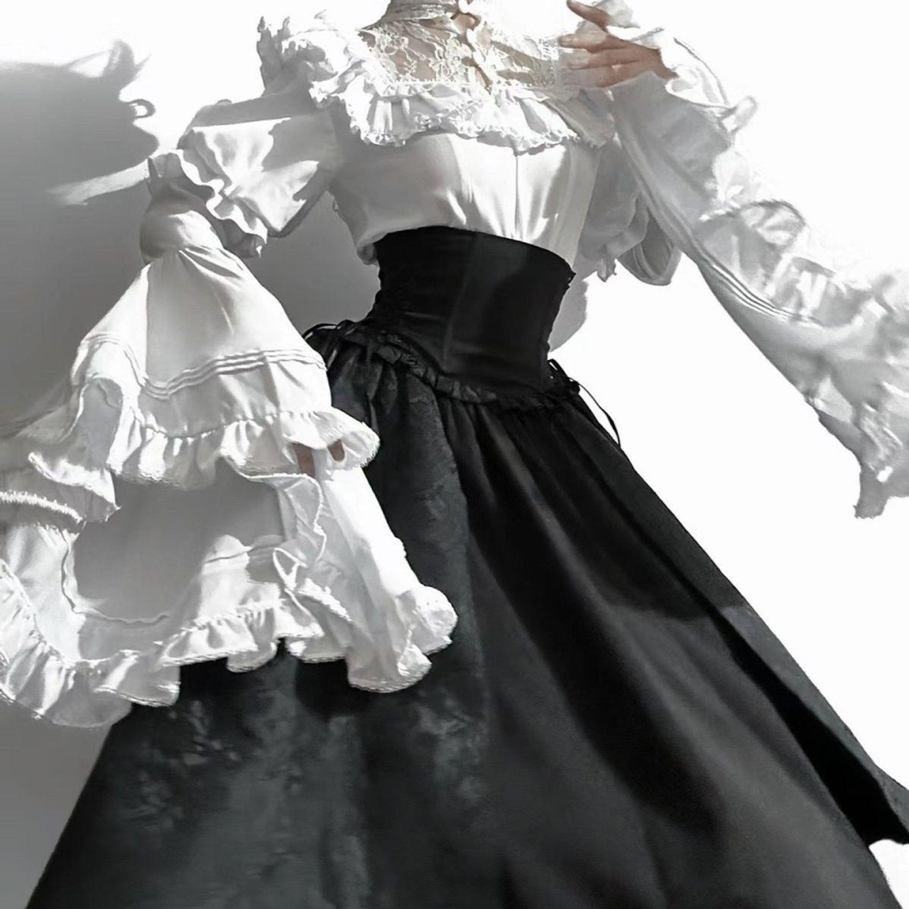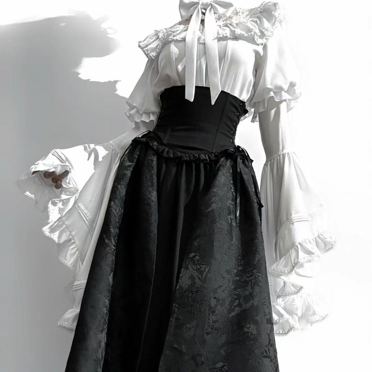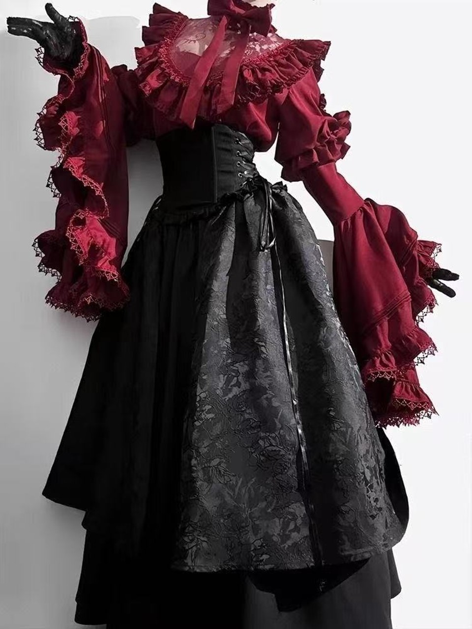ロリータ コスチューム ハロウィン ブラウス スカート 上下セット レトロ風 リボン レディース ゴスロリ 暗黒風 長袖 フリル コスプレ 衣装 洋服 日常 仮装 パーティ イベント ステージ 文化祭 学園祭 春夏秋用 ブラック 黒 ホワイト 白 ワインレッド S M L XL [g776]