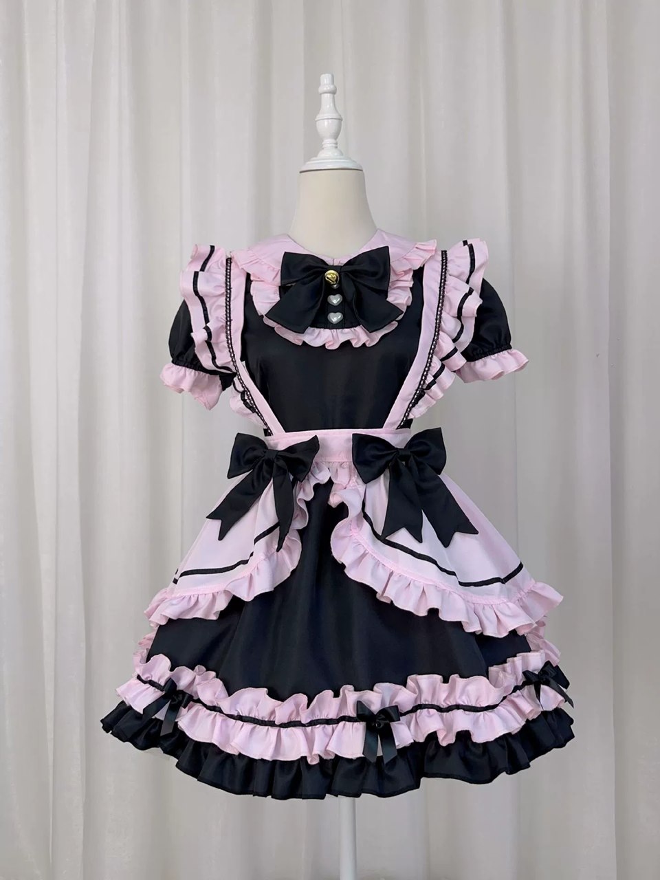 ピンクのふりふり可愛いメイド服 ミニ丈ワンピース コスチューム 半袖 フリル カチューシャ付き 蝶結び コスプレ衣装