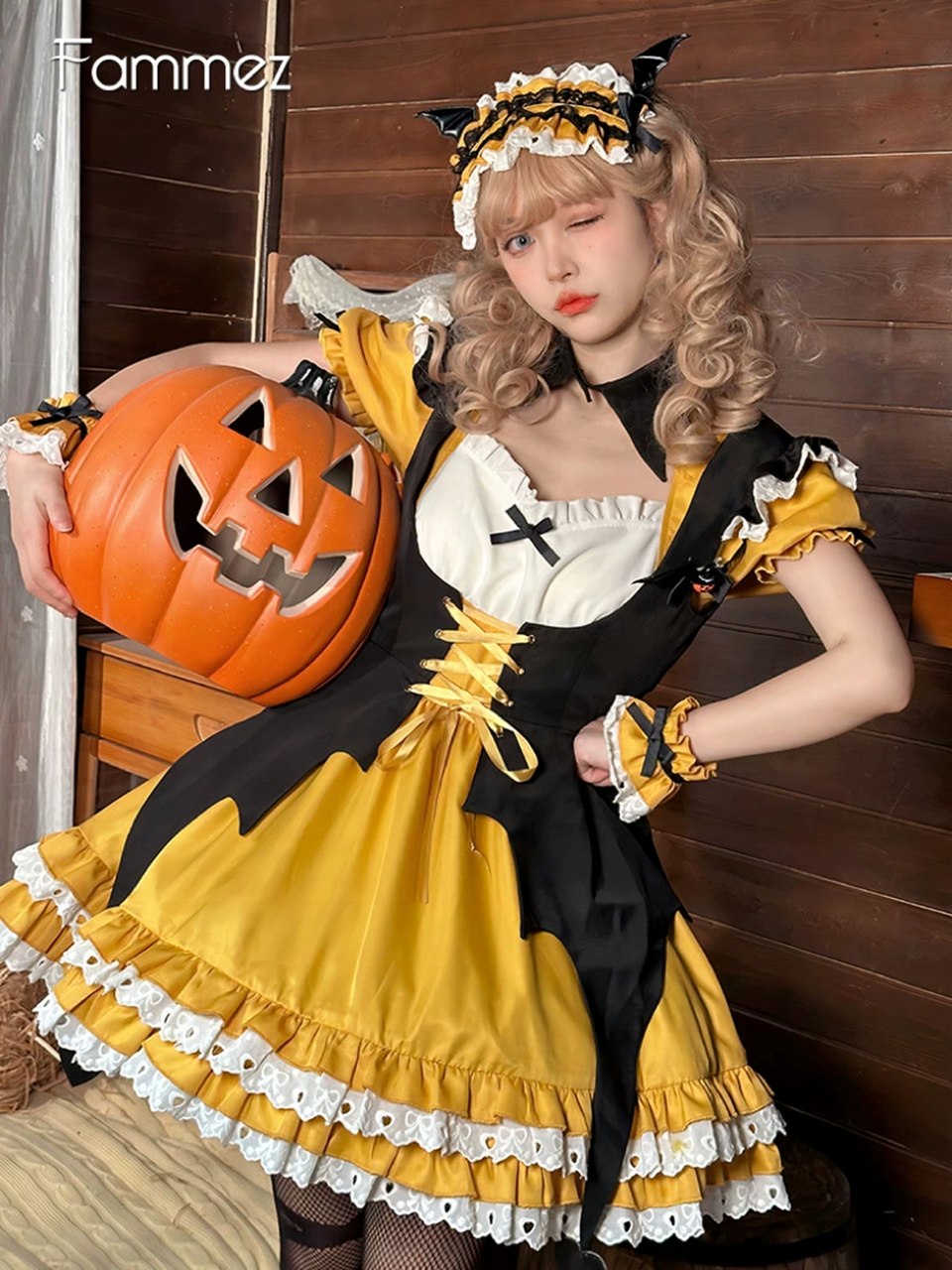 パンプキン 可愛いメイド服 ミニ丈ワンピース コスチューム 半袖 フリル カチューシャ付き 蝶結び コスプレ衣装