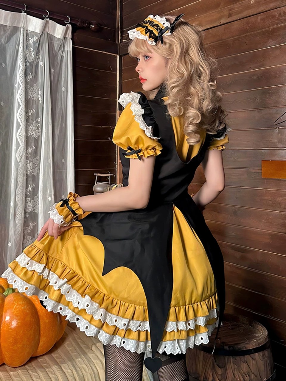 パンプキン 可愛いメイド服 ミニ丈ワンピース コスチューム 半袖 フリル カチューシャ付き 蝶結び コスプレ衣装 [g735]